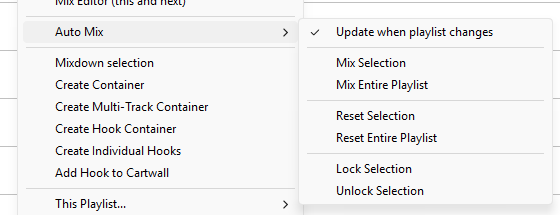 Auto Mix is controlled through the Auto Mix submenu in the right-click menu of the playlist (both the playout and the database playlist):