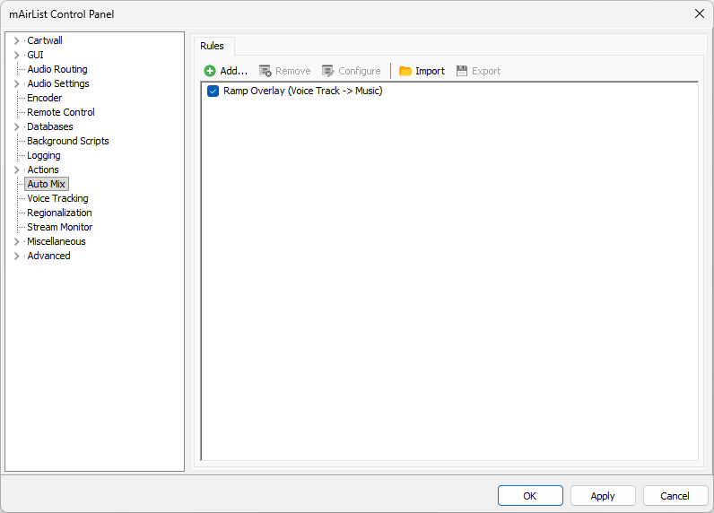 The Ramp Overlay rule specifies how a non-music item (e.g. voice track or sweeper) should be moved onto the ramp/intro of a subsequent music item.