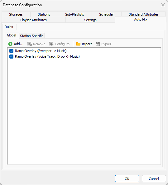 - In the mAirListDB settings (DB app → Administration → Configuration → Auto Mix tab). Here you can define “global” rules that apply to all stations managed in that database, and station-specific rules: