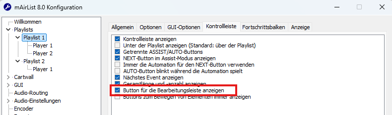 Hallo, ich habe über die “Konfiguration” - PLaylist1 - Kontrolleliste “Button für die Bearbeitungsleiste anzeigen” versucht diese auszublenden ebenso “Buttons für die Bearbeitungsleiste anzeigen”, jedoch ohne Erfolg. In der GUI.ini steht danach auch (aus meiner Sicht richtig):