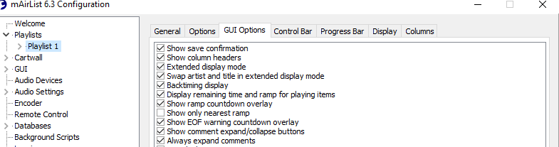 Configuration App > Playlists > Playlist 1 > GUI options