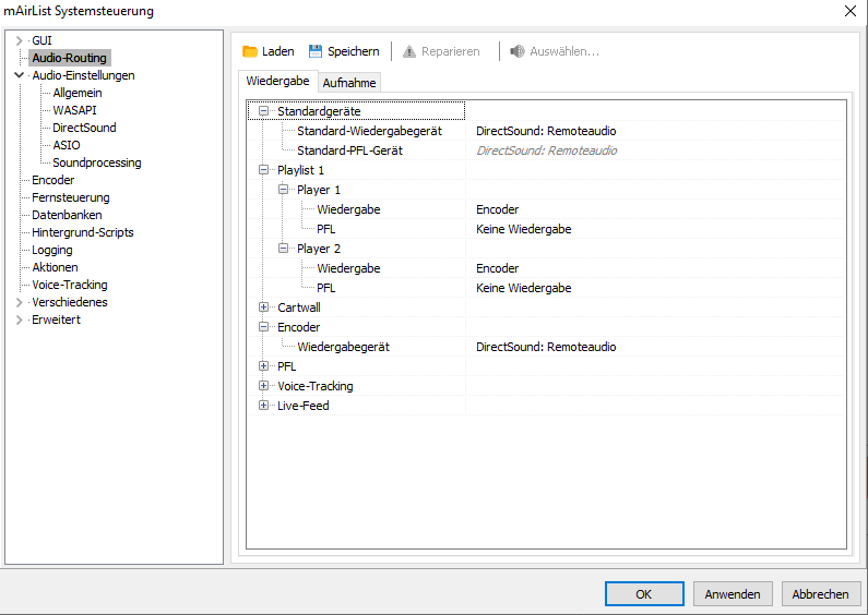 Steht dennoch in den Audiogeräten ein Remote Audio, so deaktiviert sich diese beim beenden der Remote Desktop Verbindung und mAirList bleibt hängen.