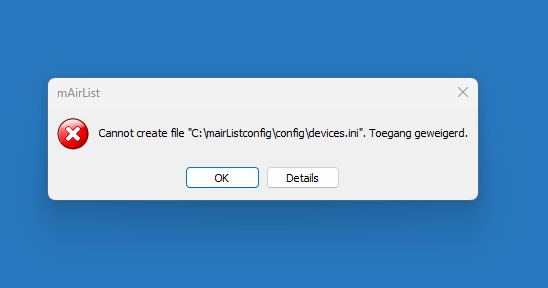 I did the install with Admin rights, manually I can go to the (hidden) path C:\ProgramData\mAirList\8.x\Config. I also created an config directory in the main mAirlist directory and deleted the hidden path, but that didn’t worked out also. The main path has no special rights.