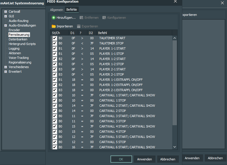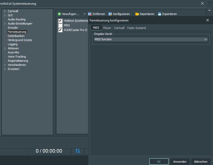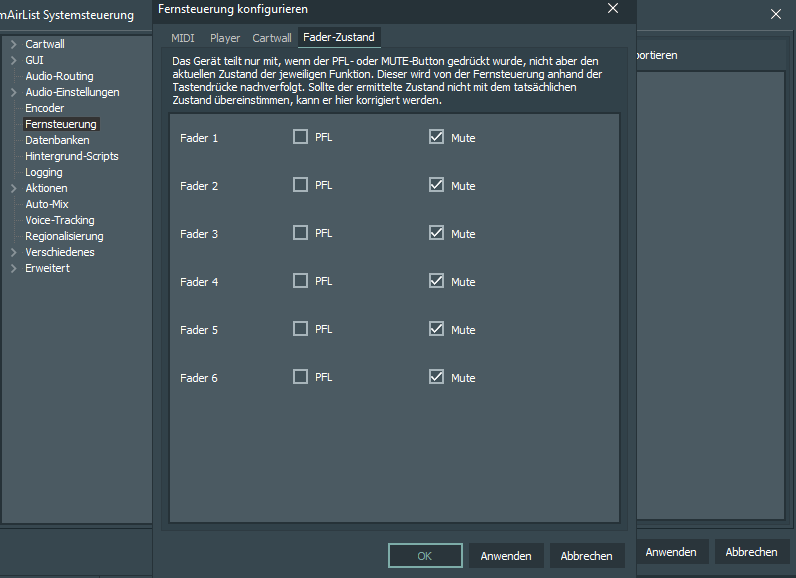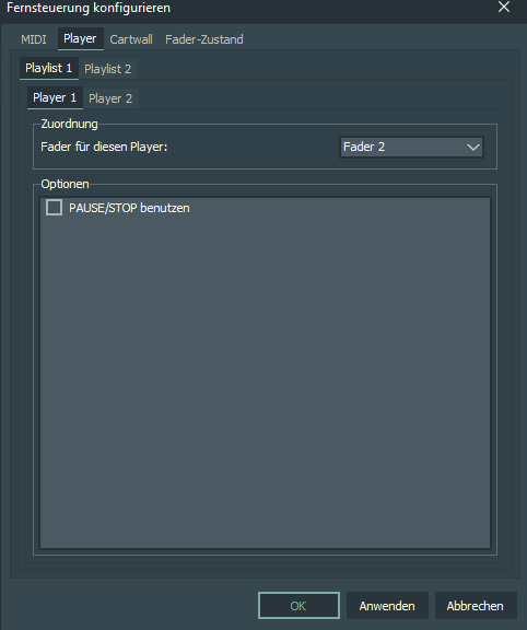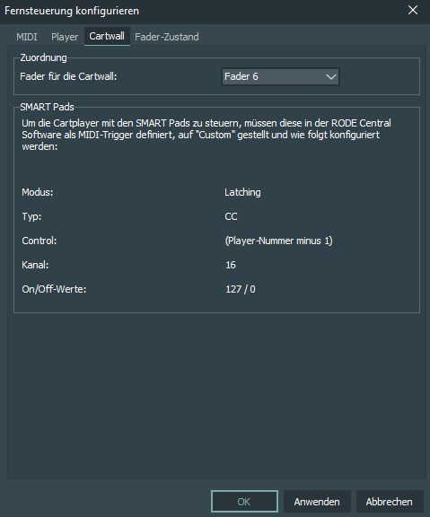 Da ist leider bei der Fernbedienungseinstellungen im Midi nur Auswählbar der Fader (Kanal) dieser steuert aber das Volumen nicht sondern schaltet den Payer A oder B nur ein, eine andere Auswahlmöglichkeit gibt es nicht. Wie gesagt, der Player A und B laufen über USB 1 des Rode. Ja und das regeln des Volumen, wie geht das den jetzt mit den vorhandenen Möglichkeiten, ist mir ein Rätzel