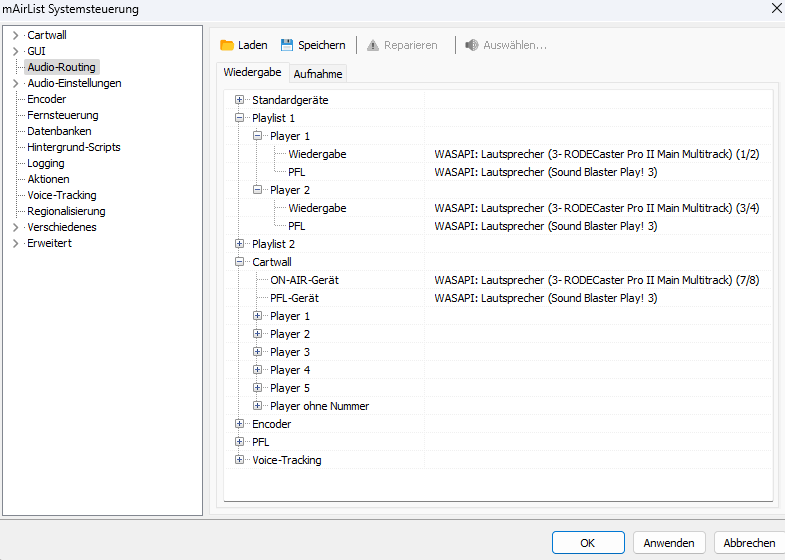 Wichtig: Dabei müssen in mAirList die Player im Audiorouting auf den Encoder gestellt sein und nicht auf eine Soundkarte des Rode.