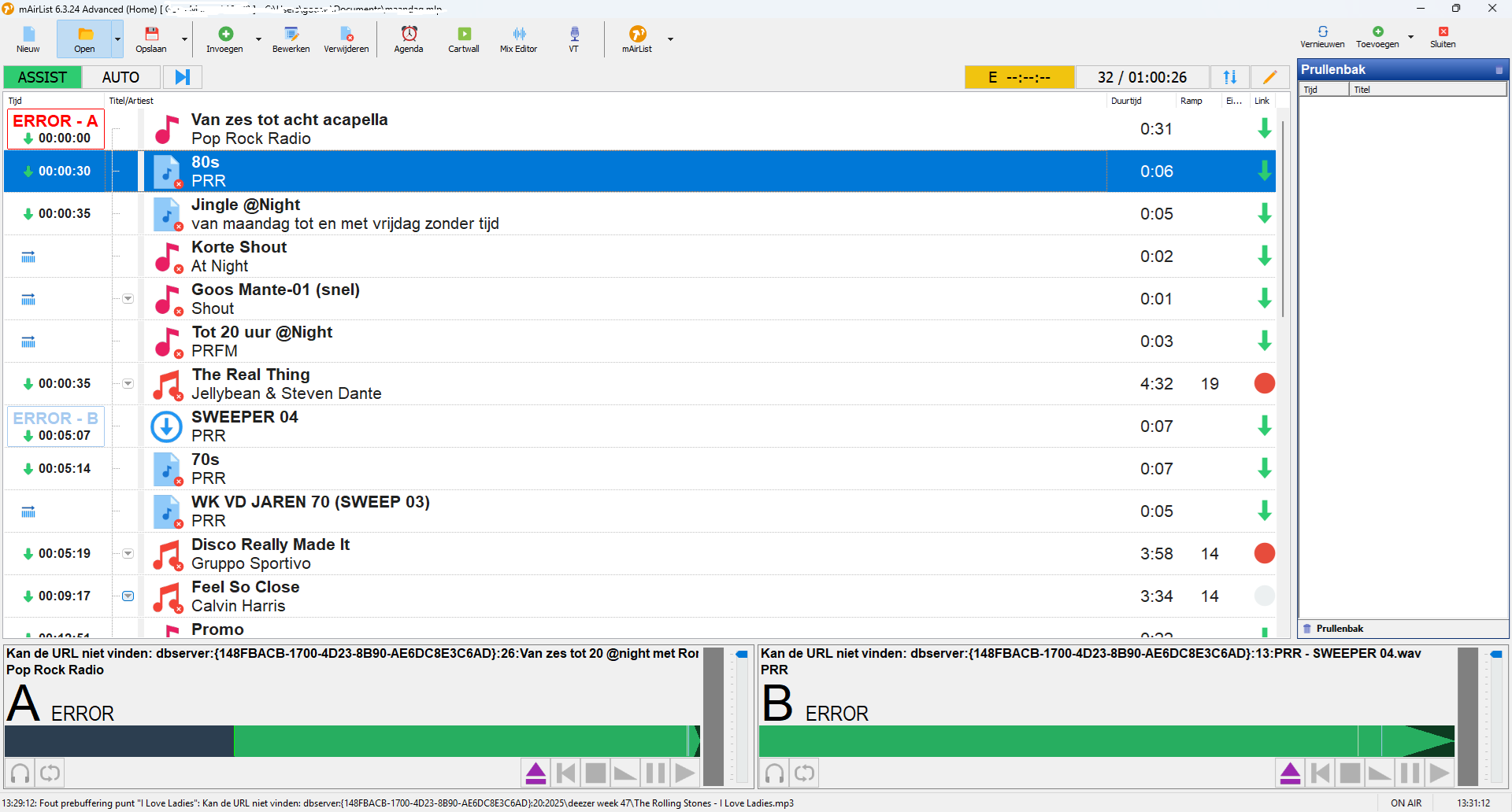 Hello, I have a strange problem when I manually compile the playlist and select the items that should be played consecutively, I now get a problem that when the first red bullet is shown, you would expect the item that should play in player A to be ready first on the next green arrow. That does not happen now, I only see it at 10 past. What is going wrong here? I have already checked if I can reset the playlist but that does not work. It concerns the Advanced Home Edition, the very latest version. I have already tried to reinstall mAirlist once, but it remains. Am I doing something wrong or is it a bug?