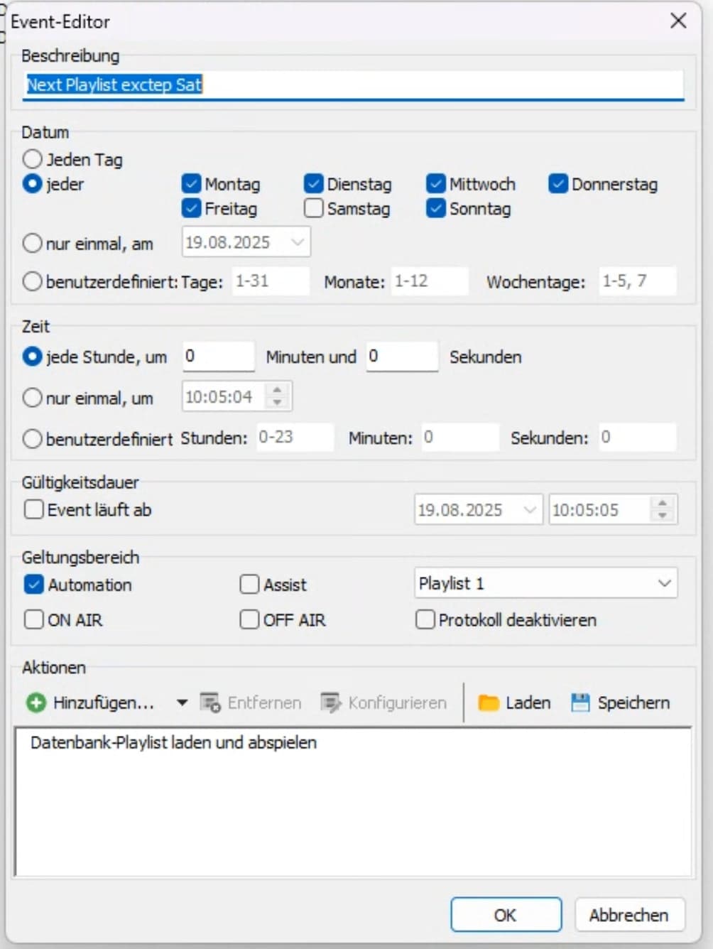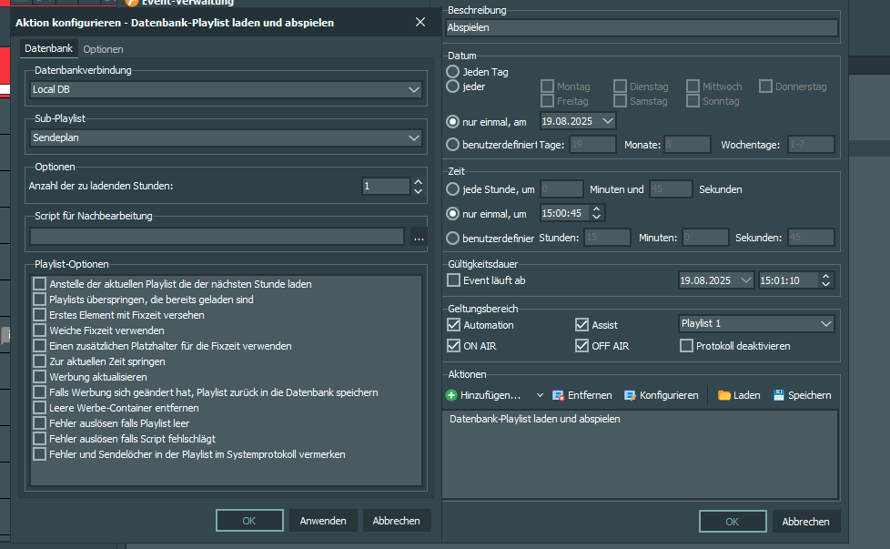 Ich habe ein Event erstellt, dass die Datenbank-Playlisten laden soll und habe gemäß Empfehlung in den Aktions-Einstellungen unter “Playlist-Optionen” noch einige Haken gesetzt.