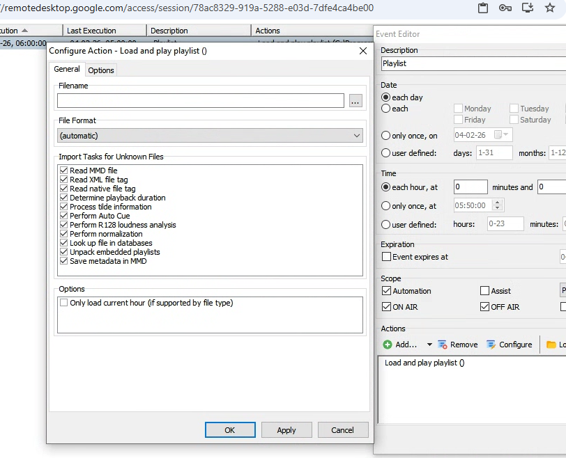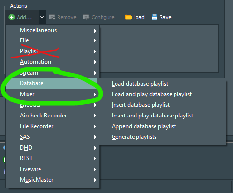 Hello all, I am configuring a mAirList 7.x Advanced Server (Home) for a friend, all is done, but I have an issue, a simple one that I don’t have on my basic local database version. It is to configure an action: Load and play the database. It is asking for a filename; I don’t have it on my basic version, and I don’t know which file this is. Can someone please give a hand?
