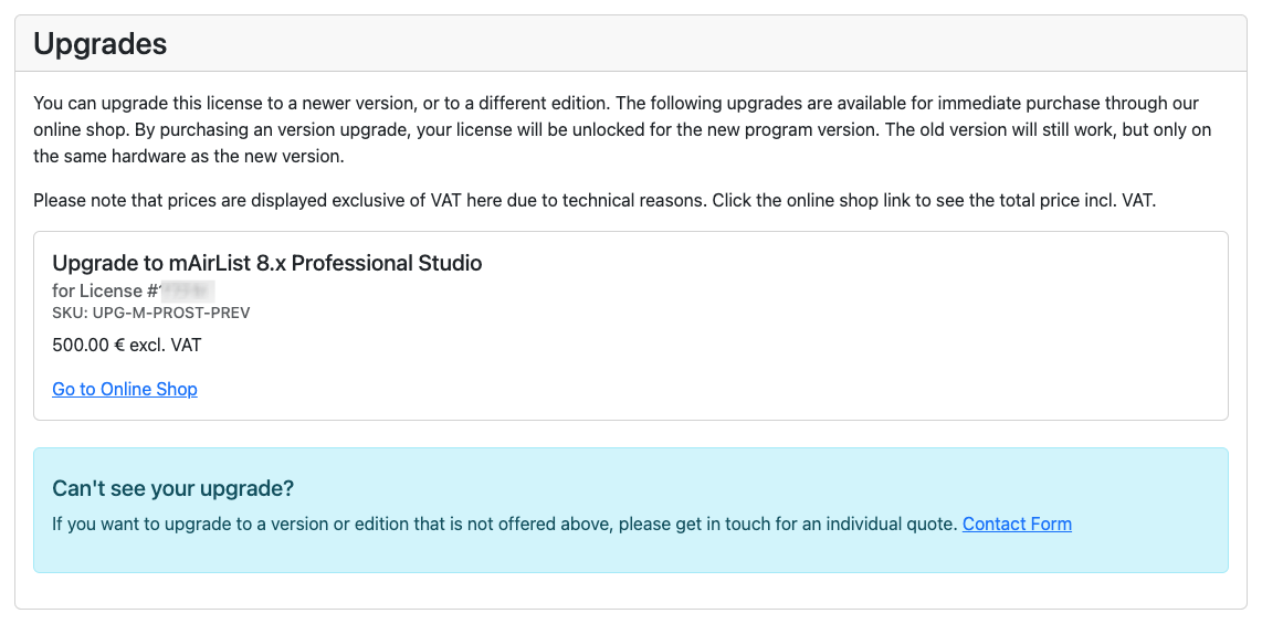 When you go the license details, the exact upgrade price is displayed, and you can proceed to the online shop to buy the upgrade: