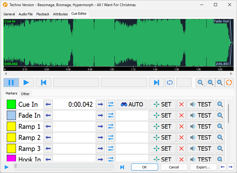 where there is also a photo. The cue editor was empty, the music started when I clicked play, but in the song settings, in the first tab, the song length was 00:00:00. This then caused the subsequent problem with generating the playlist, as it was unable to calculate the time.
