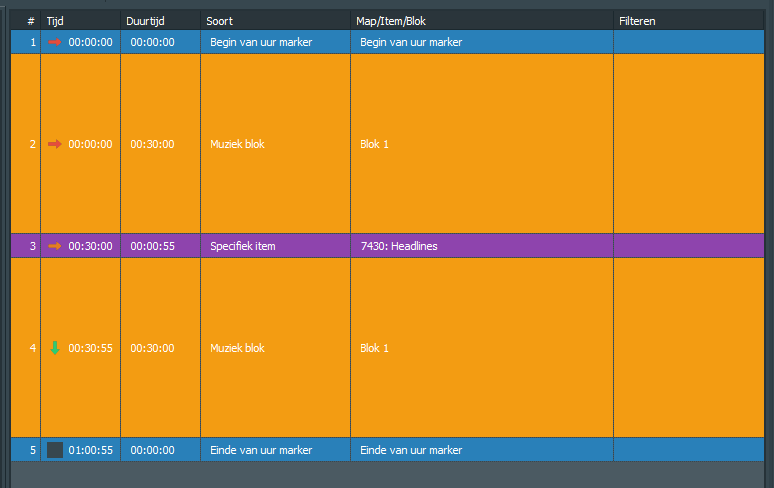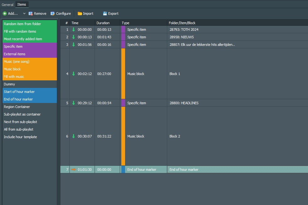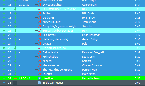 Als je werkt met muziekblokken kun je bv in je uurtemplate een blok toekennen van ongeveer 28 minuten en dan een vast item (je headlines) op het halve uur plaatsen om daarna weer een muziekblok toe te kennen. zo heb je rond het half uur je headlines. uiteraard kun je ook met een zachte vaste tijd werken. het gevaar daarbij is dat muziek afgekapt kan worden als je dit niet goed instelt. in het screenshot loopt de playlist zonder zachte vaste tijd en heb je netjes de headlines rond het halve uur. (je kunt met restricties ook toekennen dat je headlines maar bepaalde uren per dag uitgezonden worden zonder er een aparte template voor te maken)