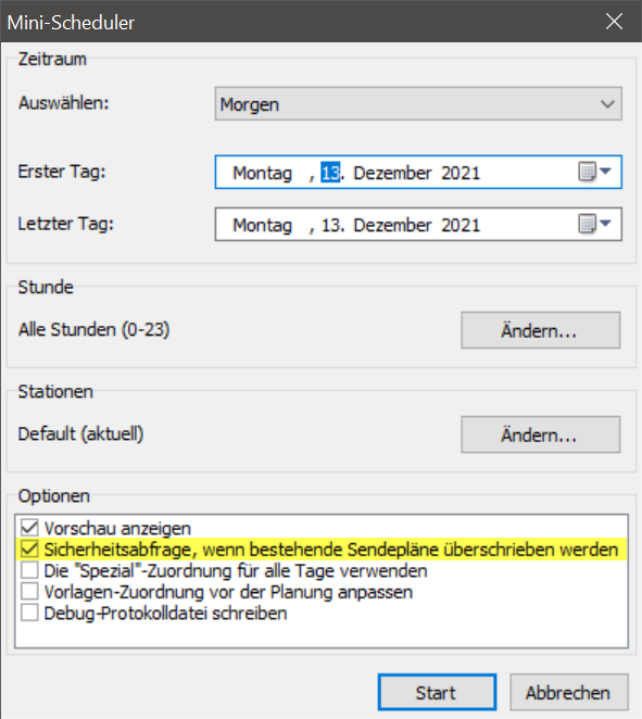 Ich möchte für betsimmte einzelne Tage ein Programm in bestimmten Stunden vorplanen und manuell anpassen. Wenn ich das heute für einen folgenden Tag erledige, dann wird dieser Tag von meiner täglichen Routine “Playlisten erzeugen” um 22:00 Uhr leider komplett überschrieben. : (