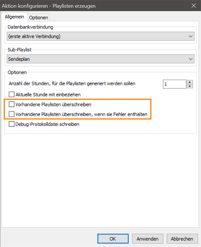 Auf die Funktion “Playlist erzeugen” klicken und in der Registerkarte “Allgemein” den Punkt “Vorhandenen Playlisten überschreiben” abwählen.