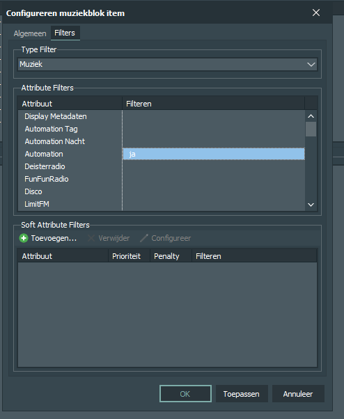 Als dit nu nog niet mogelijk is, lijkt mij dit toch een manier van het genereren van playlisten die echt een aanwinst zou zijn? Je kunt dan bijvoorbeeld op een avond heel makkelijk een disco nacht organiseren, een uur met alleen muziek van één producer/songwriter, franstalig programma, evenementen (kerst, carnaval, sinterklaas) of een paar uur per nacht vullen met alleen live muziek. Maar ook heel makkelijk muziek uitsluiten zonder dat je de jaarstructuren van je mappen doorbreekt. Of ben ik nog een echte NOOB en kan dit allemaal op een andere makkelijke manier? Zo ja, wat is dan de functie van de atributen? En hoe gebruiken jullie die?