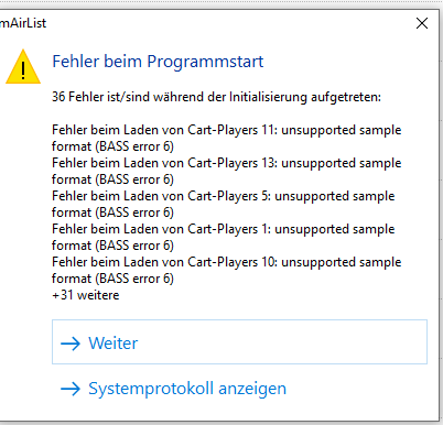 Starte ich Mairlist kommt eine Fehlermeldung, bezüglich der Cartwall: BassError6 unsupported sample Format, siehe Screenshot.