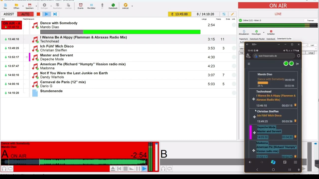 Abgesehen vom bereits sehr gut funktionierenden Studiomonitor von @ssnoopy , der vom folgenden Moderator wunderbar zum Erkennen des Titelendes/Stundenendes genutzt werden kann, bastelt er auch gerade an einem neuen Projekt, das für folgende Moderatoren ebenfalls sehr brauchbar sein kann, da hier sogar Titel remote verschoben werden können, um das Ende passender zu machen.