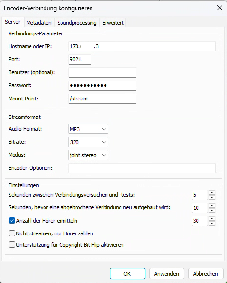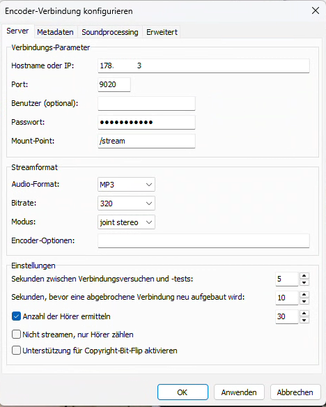 Hier die Einstellungen vom Server