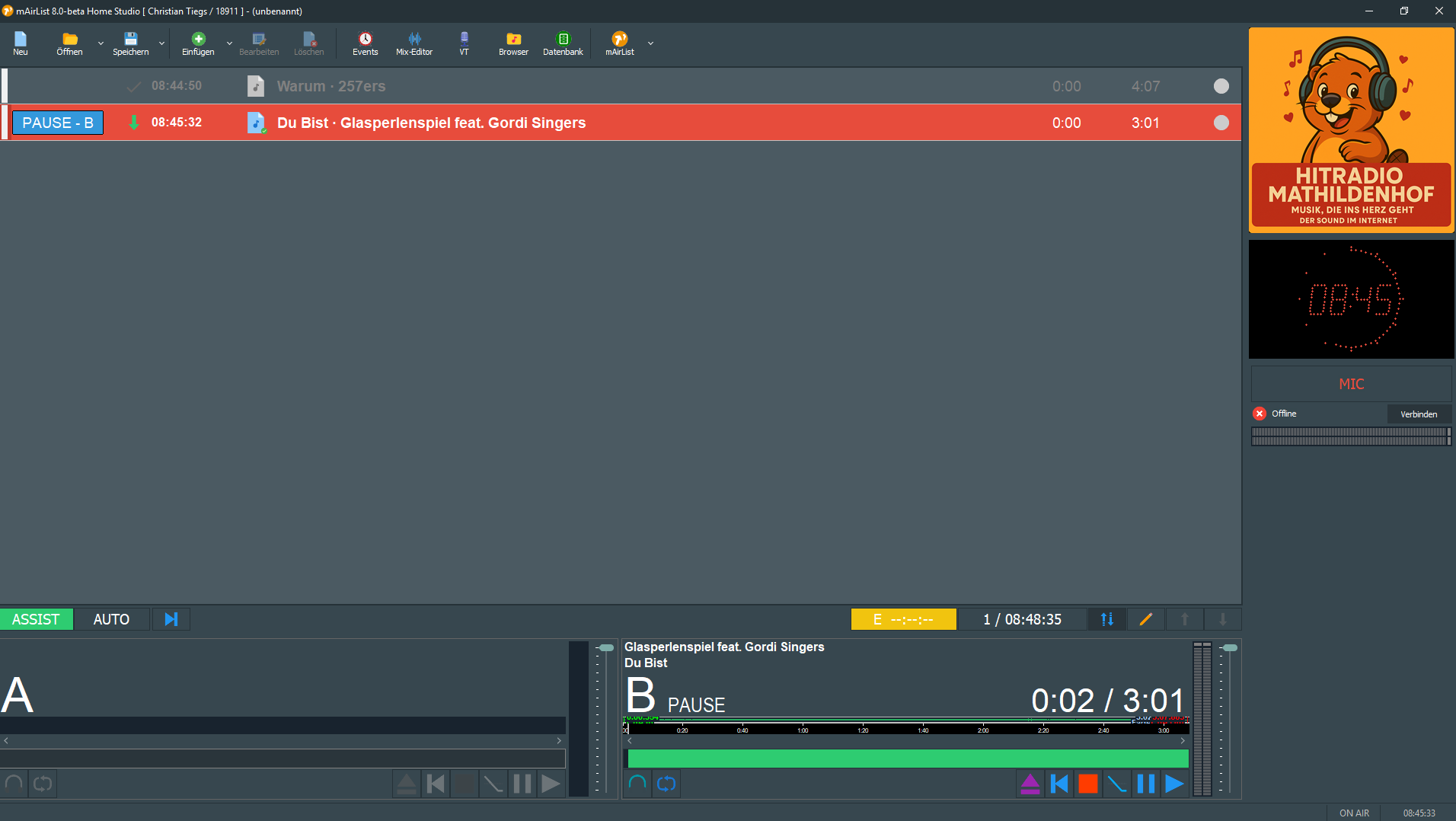 ich schreibe hier auch mal etwas hinein, denn mir ist etwas aufgefallen. In der Playlist ist der Artist und der Titel vertauscht, was ich aber bei Player A und Player B schon behoben habe. Ich habe sämtliche Häclchen gesetzt, aber auch schon wieder zurückgesetzt und noch nicht gefunden woran es lag. Kann das sein, dass es ein Bug unter der Beta-Version von mAIRlist 8 sein kann?