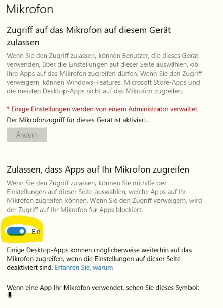Unter “Einstellungen”-“Mikrofon”-“Zulassen, dass Apps auf Ihr Mikrofon zugreifen” wurde der Schalter auf “AUS” gesetzt. Dadurch haben wir auf Line In kein Signal gehabt. Nach langer Suche an unserem Airlite, der Soundkarte, Kabel,…, konnte uns der Support helfen, obwohl es kein mAirList Problem an sich war.