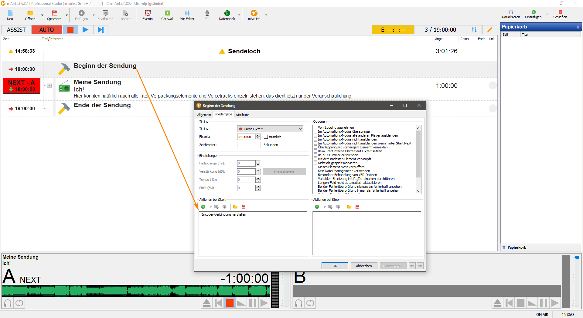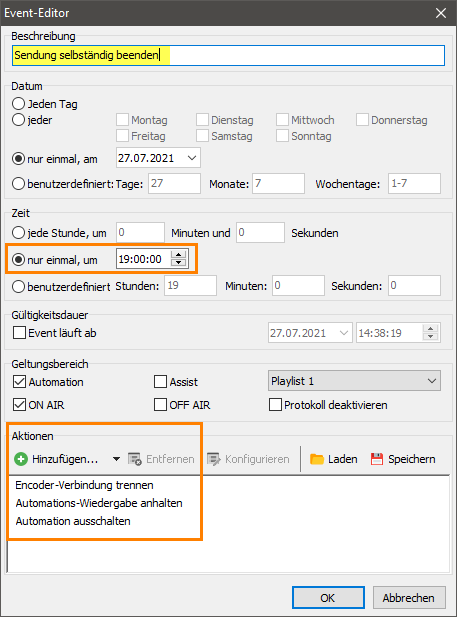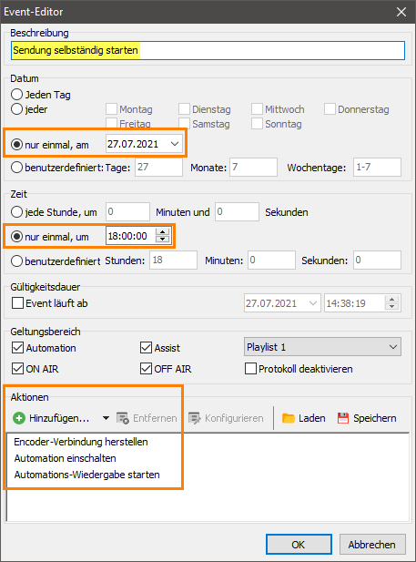 Als Befehl trägst du dann nur “Encoder-Verbindung herstellen” unter “Aktionen bei Start” des Befehls um 18 Uhr ein.